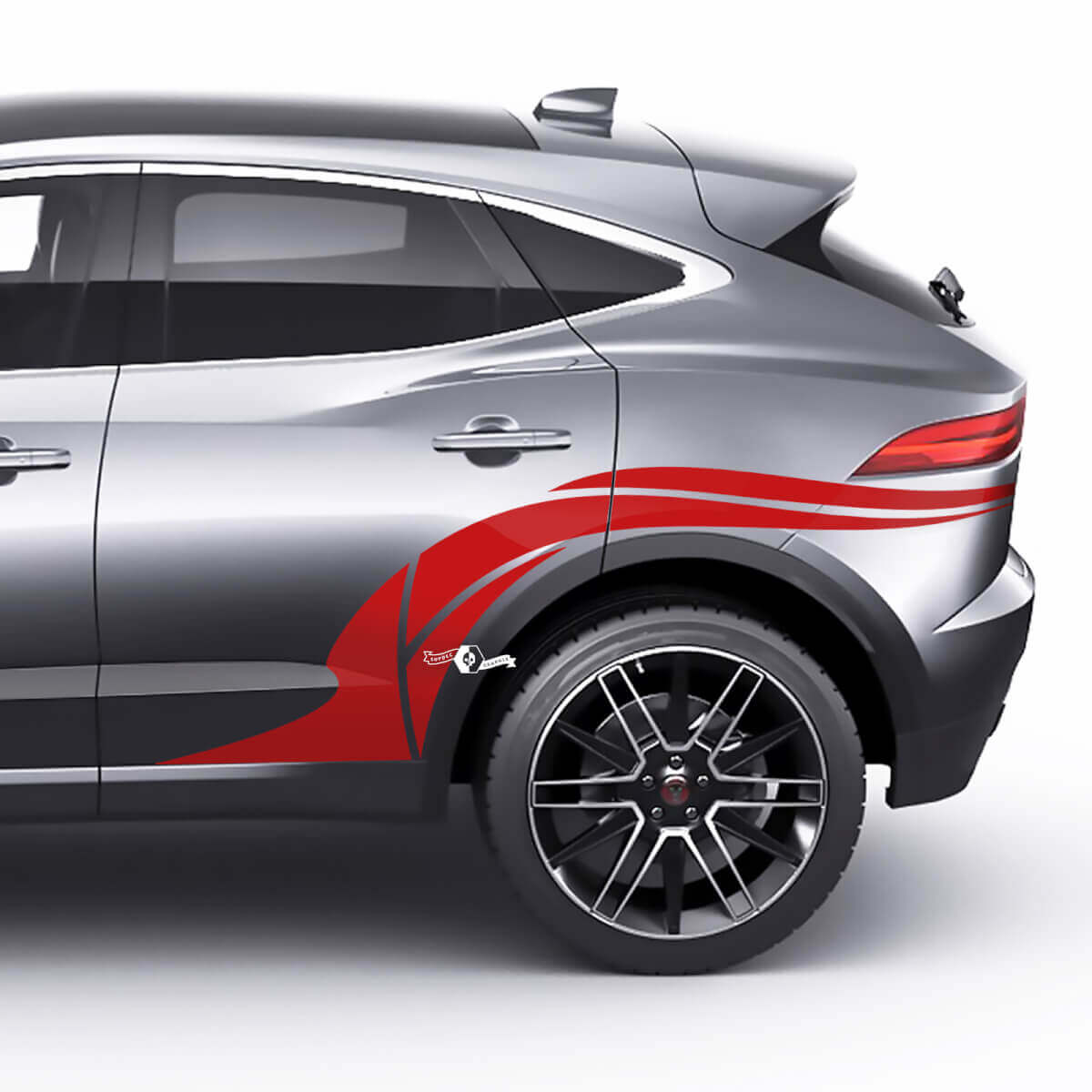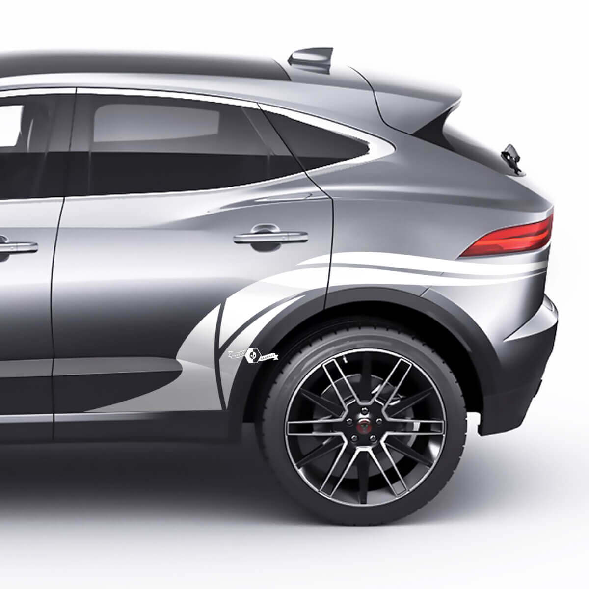 Upgrade uw Jaguar E-Pace met onze achterwielboog grafische sticker, ontworpen om perfect te passen en het uiterlijk van het achterwielgebied van uw voertuig te verbeteren.