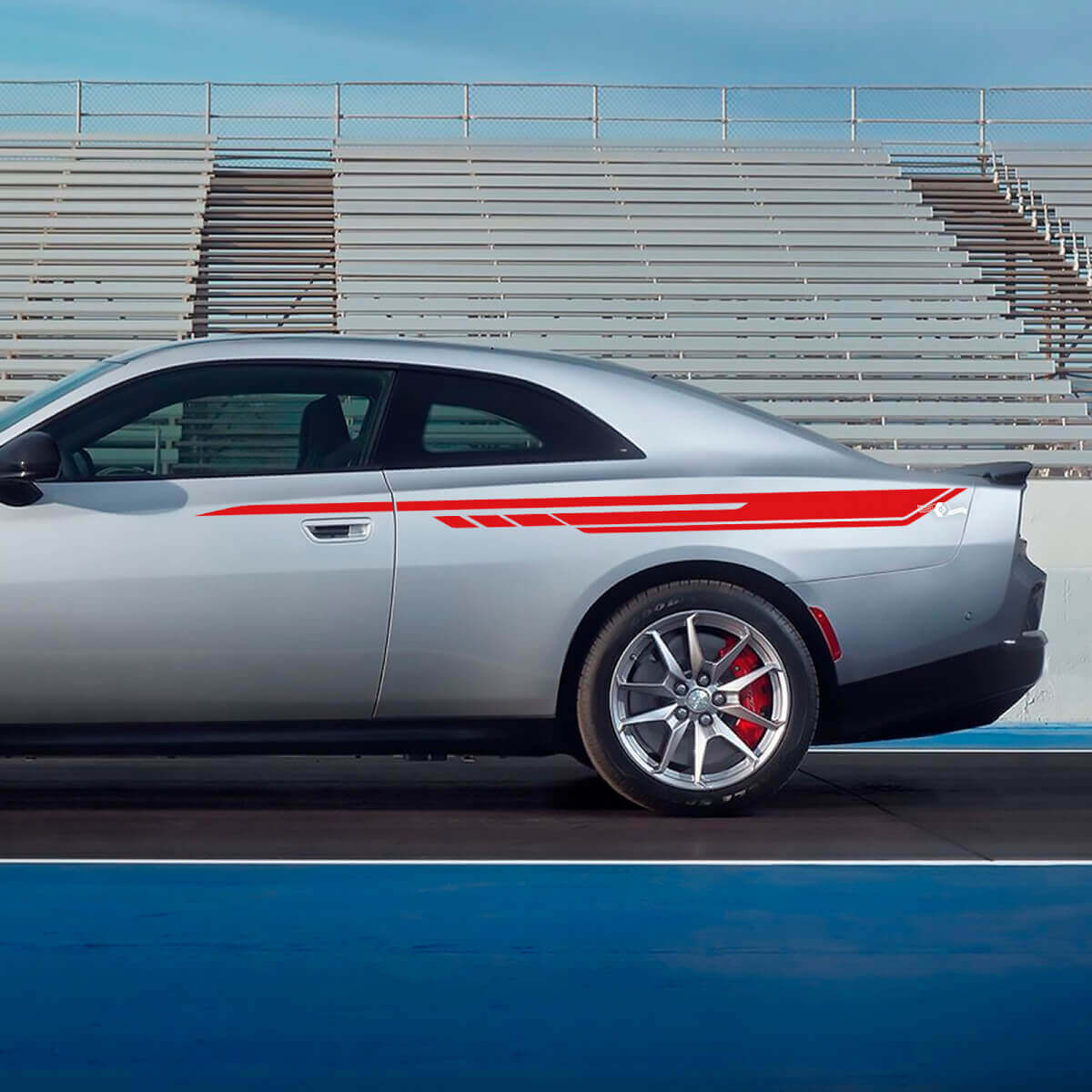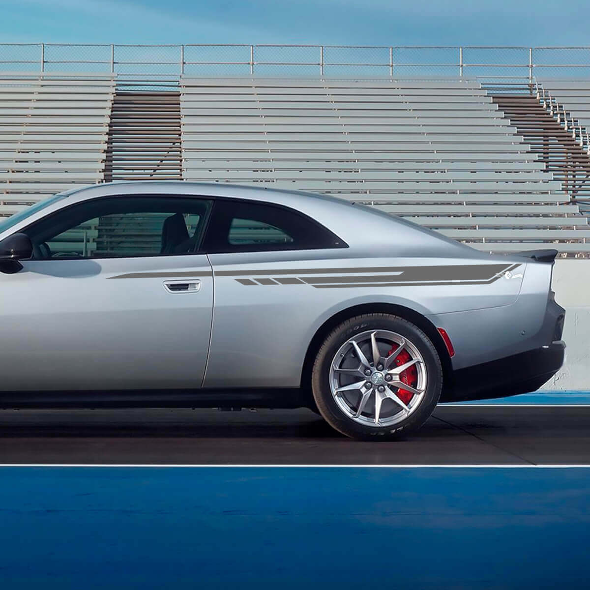 Verbeter de gedurfde, moderne uitstraling van uw Dodge Charger Electric met Side Quarter Panel Decal Stripes. Deze hoogwaardige vinylgraphics voegen een strakke, prestatiegerichte touch toe, die het agressieve ontwerp van uw voertuig aanvult.